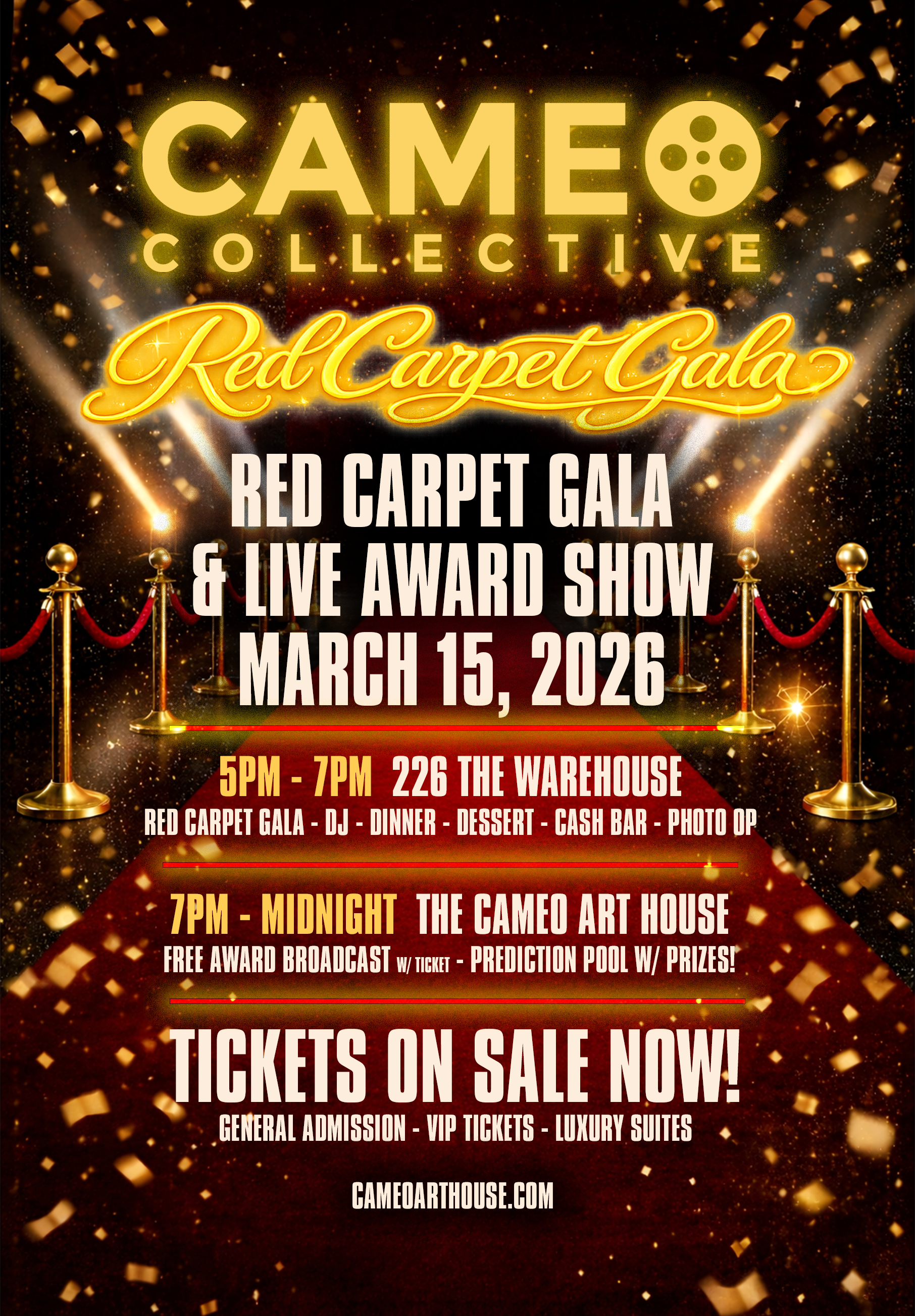 All proceeds benefit CAMEO Collective, a 501(c)(3) nonprofit, and help support our mission to keep independent cinema thriving in Fayetteville. Your attendance directly contributes to film programming, special events, and the preservation of the CAMEO as a community gathering space for art, stories, and shared experiences.